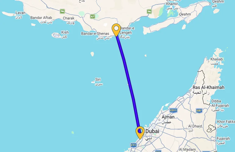 مسیر بندرلنگه به دبی بین ۵ تا ۸ ساعت و مسیر بندرعباس به شارجه حدود ۷ تا ۸ ساعت طول میکشد. پس از رسیدن به شارجه، حدود ۳۰ دقیقه زمینی تا دبی زمان میبرد.
